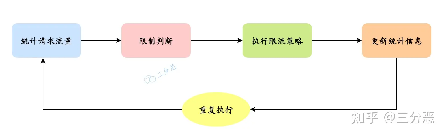- 重复执行以上步骤:不断地统计请求流量、判断是否超过限制、执行限流策略、更新统计信息