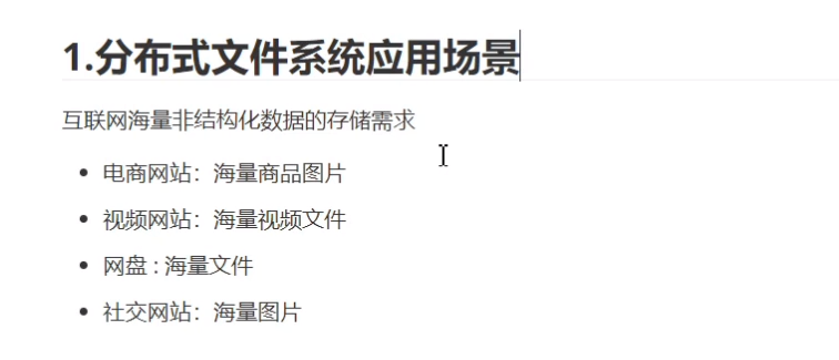 - 适合于存储大量给结构化数据:图片、视频、日志文件。。。