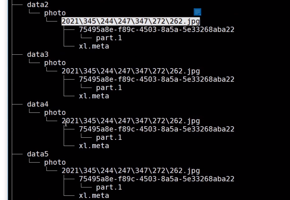 - 场景:现在我们的服务器上有八块磁盘(一个set)也就是8个drive,然后我们存储一个对象文件,那么这8块磁盘(drive)都会存储这个对象