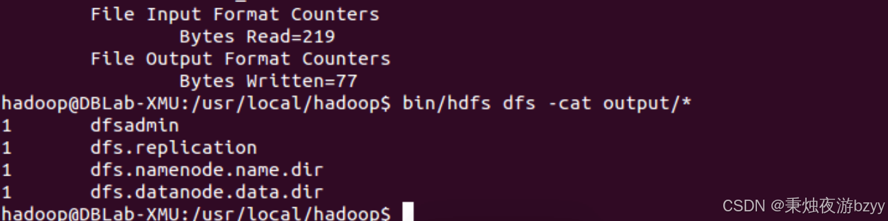 伪分布式运行 MapReduce 作业的方式跟单机模式相同,区别在于伪分布式读取的是HDFS中的文件(可以将单机步骤中创建的本地 input 文件夹,输出结果 output 文件夹都删掉来验证这一点)。