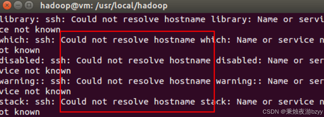 如果启动 Hadoop 时遇到输出非常多“ssh: Could not resolve hostname xxx”的异常情况,如下图所示: