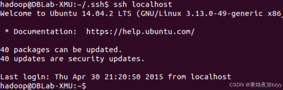 此时再用 ssh localhost 命令,无需输入密码就可以直接登陆了,如下图所示。