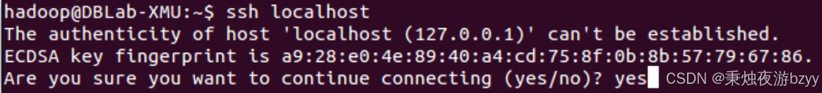 此时会有如下提示(SSH首次登陆提示),输入 yes 。然后按提示输入密码 hadoop,这样就登陆到本机了。