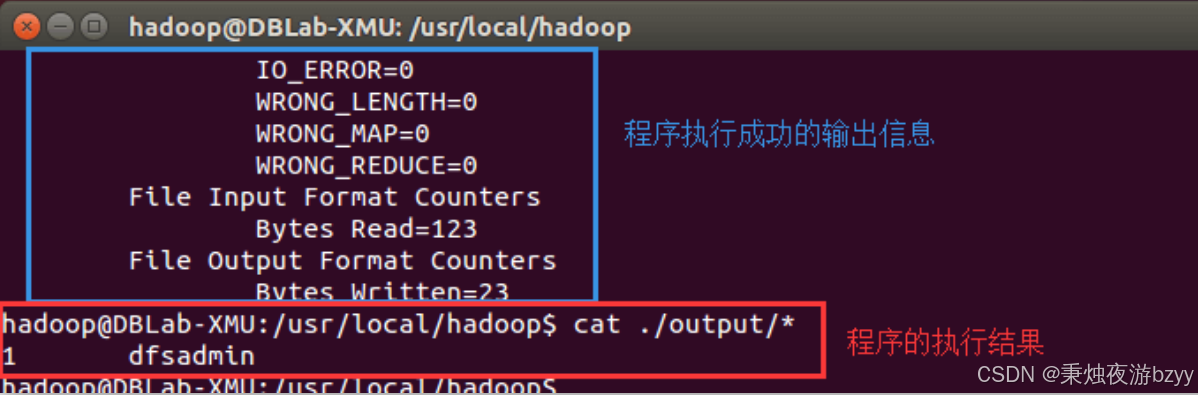 Hadoop 运行程序时,输出目录不能存在,否则会提示错误 "org.apache.hadoop.mapred.FileAlreadyExistsException: Output directory hdfs://localhost:9000/user/hadoop/output already exists" ,因此若要再次执行,需要执行如下命令删除 output 文件夹: