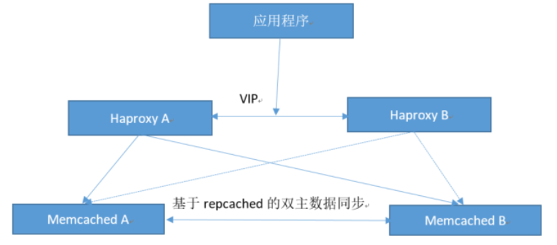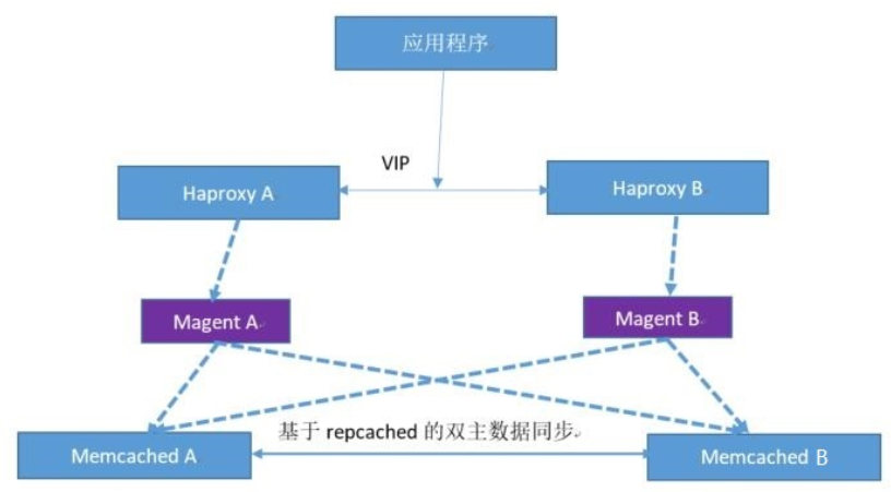 Magent 是google开发的项目,应用端通过负载均衡服务器连接到 magent,然后再由 magent 代理用户应用请求到 memcached 处理,底层的 memcached 为双主结构会自动同步数据,本部署方式存在 magent 单点问题,因此需要两个 magent 做高可用