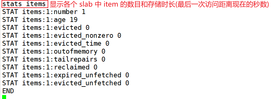 stats items #显示各个 slab 中 item 的数目和存储时长(最后一次访问距离现在的秒数)。