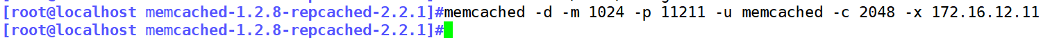 [root@localhost memcached-1.2.8-repcached-2.2.1]#memcached -d -m 1024 -p 11211 -u memcached -c 2048 -x 172.16.12.11