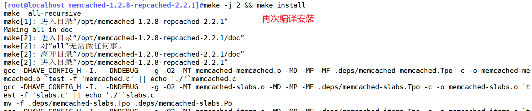 [root@localhost memcached-1.2.8-repcached-2.2.1]#make -j 2 && make install