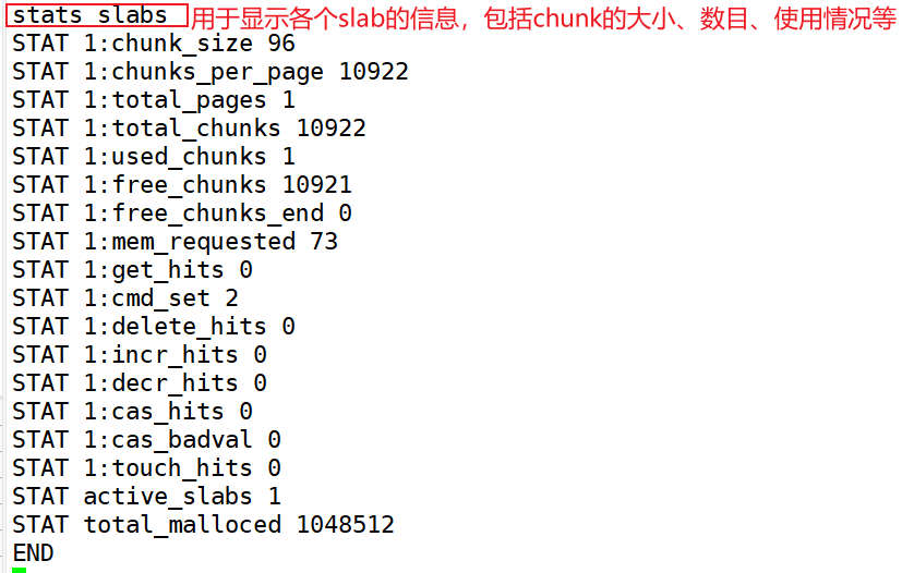 stats slabs #用于显示各个slab的信息,包括chunk的大小、数目、使用情况等