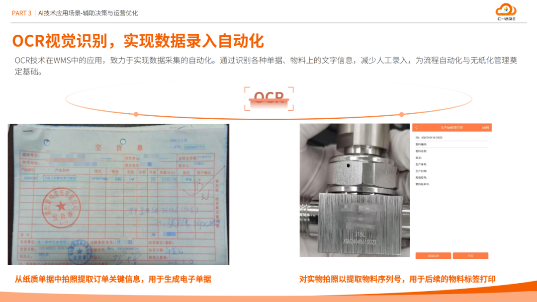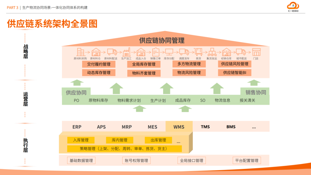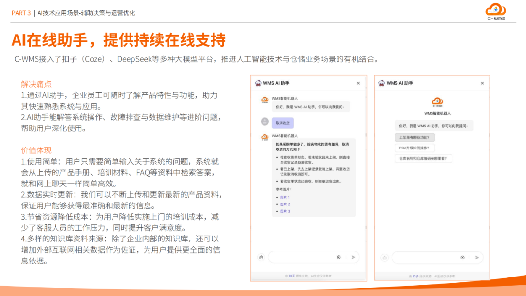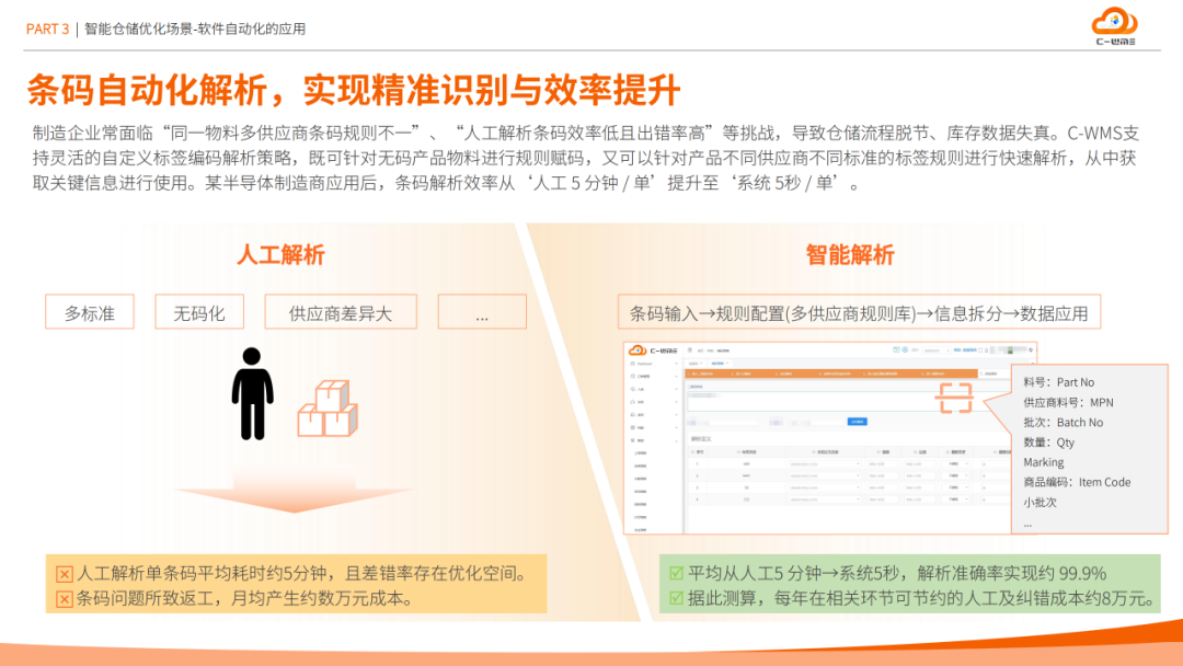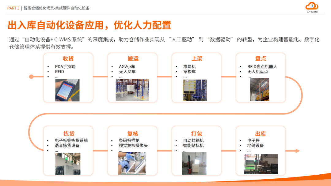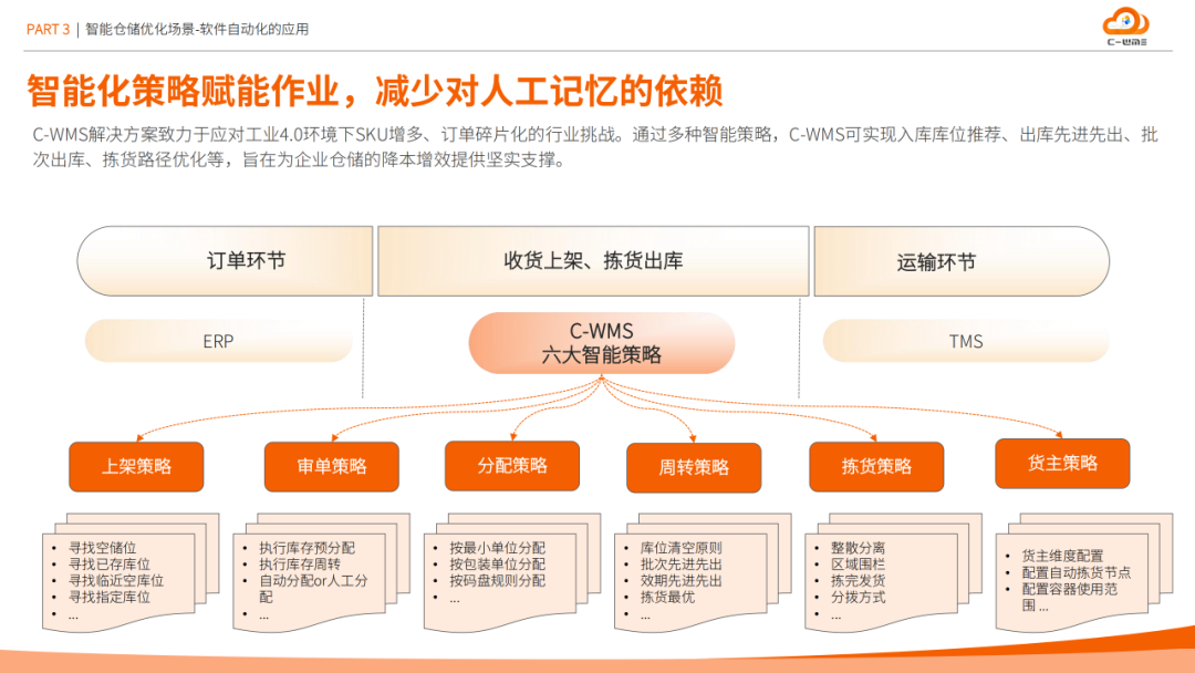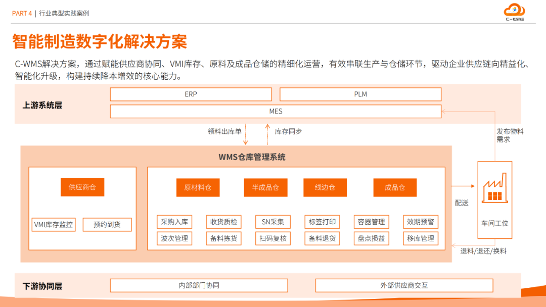 解决方案:以 C-WMS 系统为核心,整合软件智能策略、硬件自动化设备、AI 技术,打通供应链全链路数据,实现高效协同。