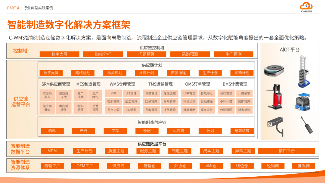 弘人网络自主研发 OMS、TMS、WMS 等供应链软件,提供公有云、私有云服务,已服务 3000 + 仓库,助力企业优化物流成本、提升供应链效率。这份白皮书聚焦智能制造行业物流与供应链数字化转型,核心是弘人网络以 C-WMS 为核心的数字化解决方案,为行业提供转型路径参考。解决方案:以 C-WMS 系统为核心,整合软件智能策略、硬件自动化设备、AI 技术,打通供应链全链路数据,实现高效协同。实践案