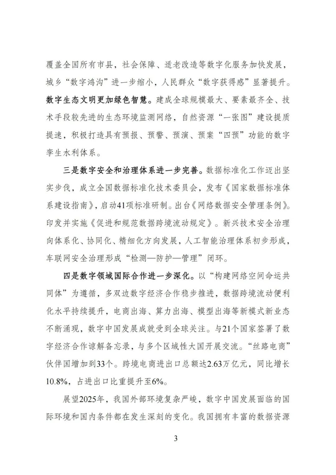 前景展望:2025 年网络文明、“人工智能 +”、数据市场、数据基础设施、国际合作等方面将取得进一步发展,推动数字中国建设迈向新高度。
