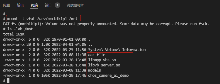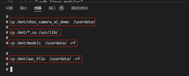 - 执行下面的命令,拷贝mnt目录下面的ohos_camera_ai_demo至userdata目录,拷贝mnt目录下面的libvb_server.so和 libmpp_vbs.so至/usr/lib/目录下,再将models和aac_file文件夹拷贝至userdata目录下