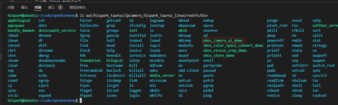 - 编译成功后,即可在out/hispark_taurus/ipcamera_hispark_taurus_linux/rootfs/bin目录下,生成 ohos_camera_ai_demo可执行文件,如下图所示: