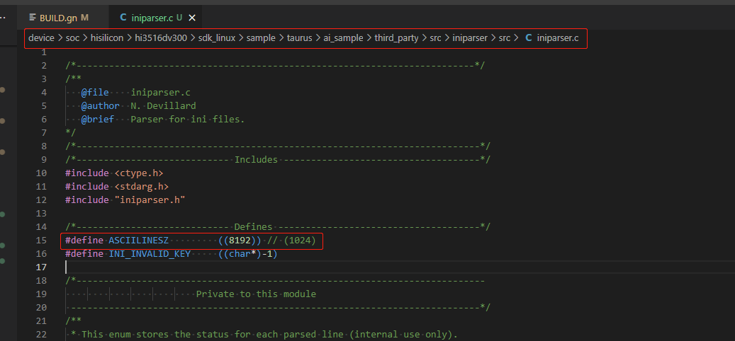 - 步骤2:使用IDE打开device/soc/hisilicon/hi3516dv300/sdk_linux/sample/taurus/ai_sample/third_party/src/iniparser/src/iniparser.c文件,把第15行的1024改成8192。