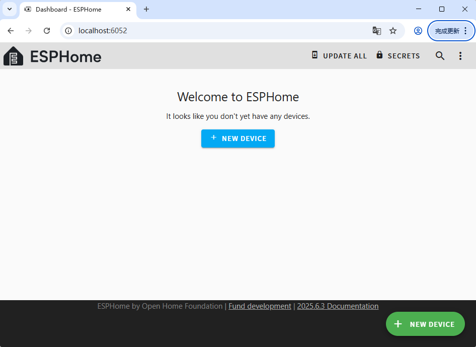 4,打开浏览器访问地址 http://localhost:6052 ,就能看到你部署的 ESPHome 仪表盘,可以通过仪表盘添加新设备,配置你的 YAML 文件等。
