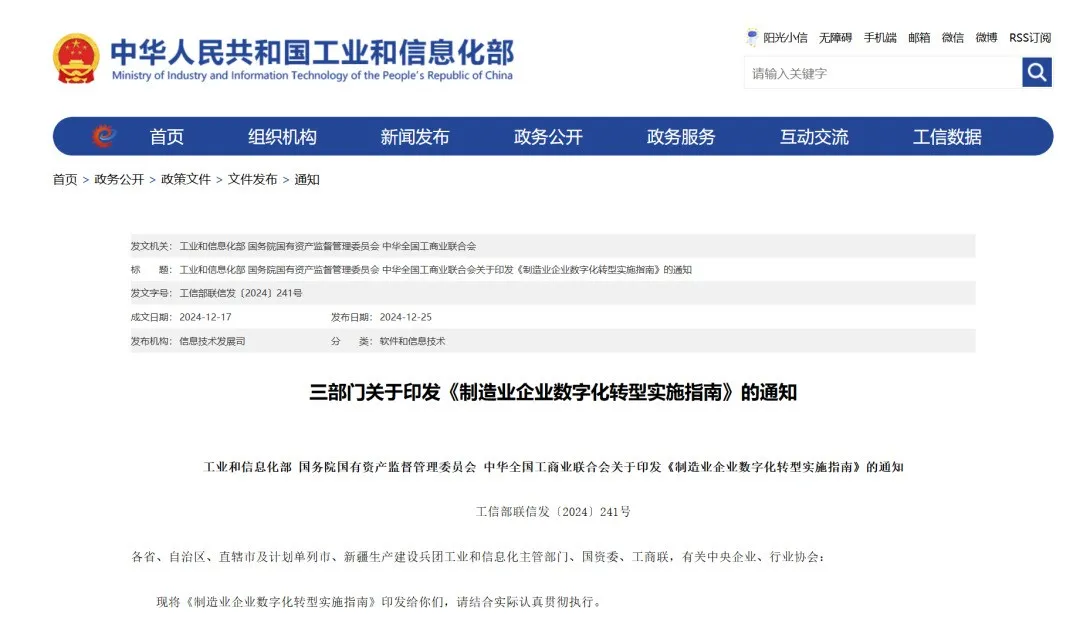 12月25日,工业和信息化部、国务院国有资产监督管理委员会、中华全国工商业联合会三部门印发《制造业企业数字化转型实施指南》(以下简称《实施指南》)。