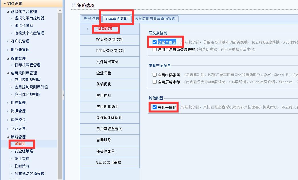 在策略组的独享桌面策略->基础配置下,勾选隐藏导航条和关机一体化两项