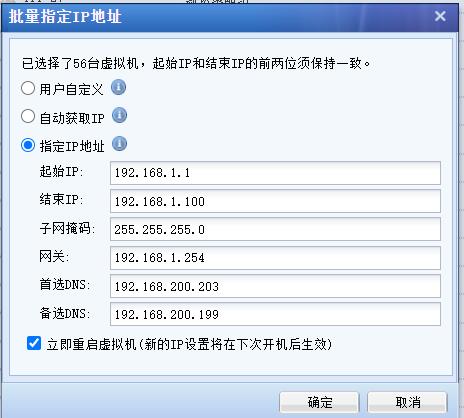 选择指定IP地址,指定起始IP和结束IP后,系统会自动为资源下的所有虚拟机按顺序配置固定的IP地址: