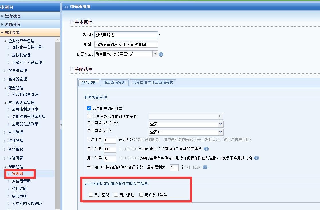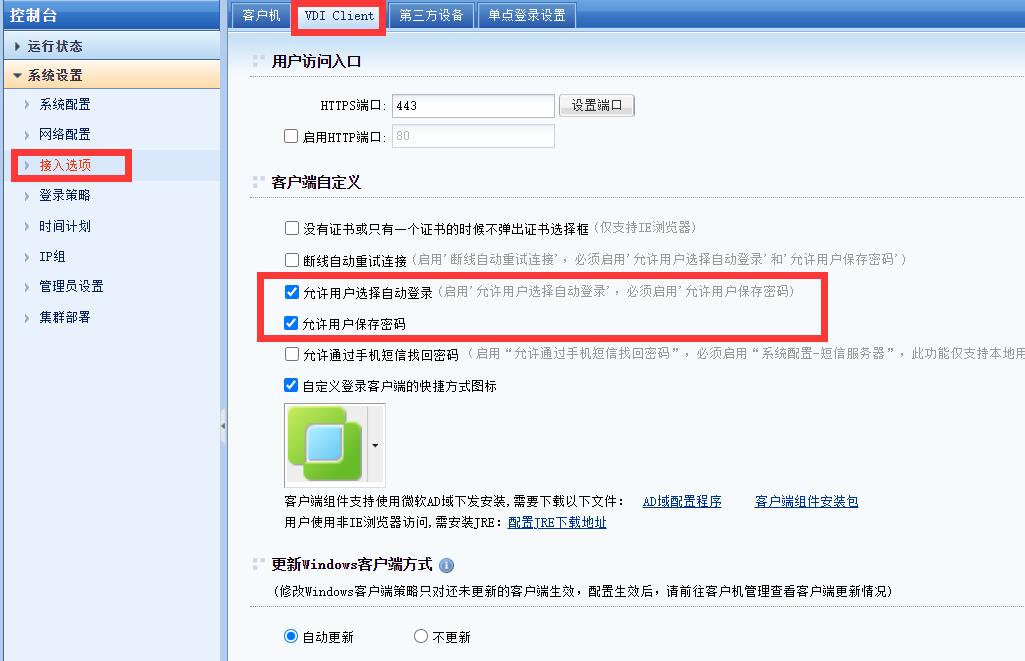 需要在接入选项下的VDI Client下勾选允许用户选择自动登录和允许用户保存密码。否则瘦客户端无法实现自动登录到平台牵引虚拟机的功能