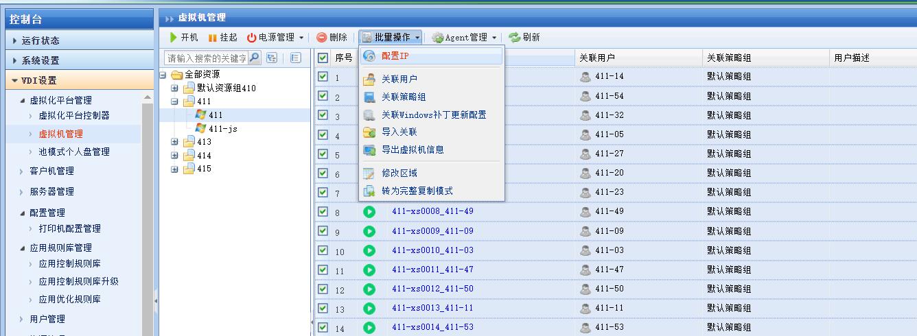 虚拟机配置:虚拟机名称例如415- 那么系统会根据设定的虚拟机资源数量自动为每一台虚拟机编号为415-1 415-2 ... 315-100等