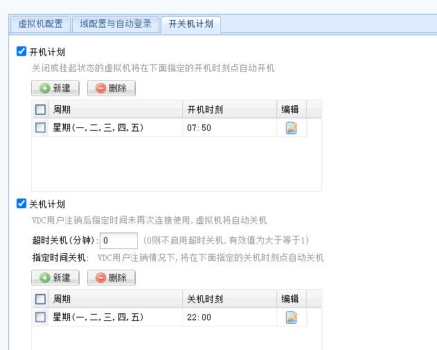 配置虚拟机资源的开关机计划,一般上课前20分钟自动开好,晚上确定的下课时间之后自动关闭。提前开好是为了减少用户从启动瘦客户端到进入虚拟机windows使用状态的等待时长。如下图所示: