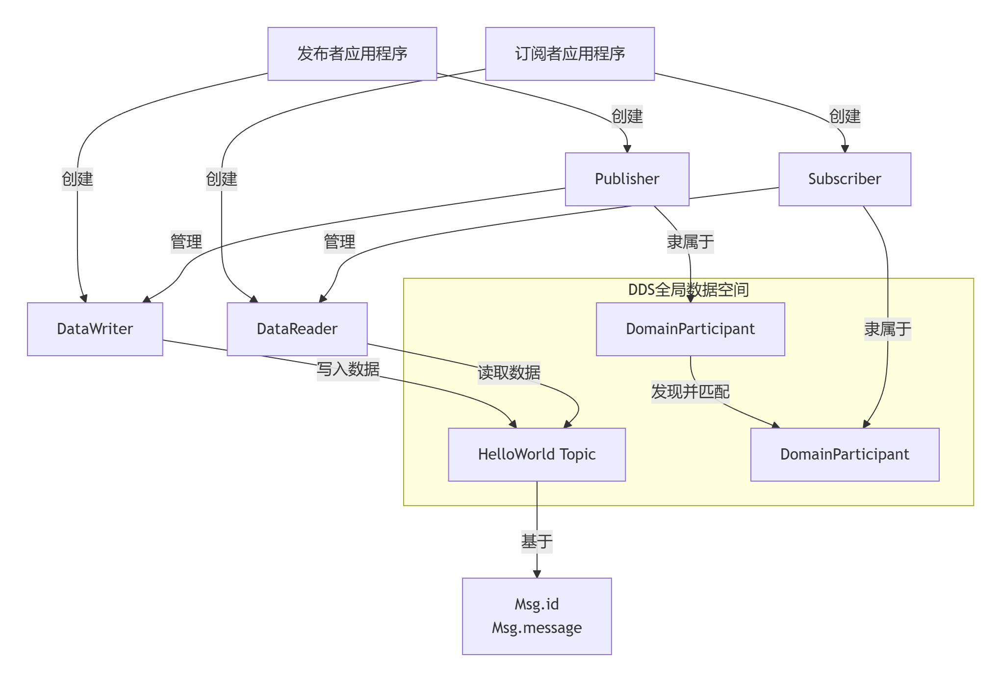 上图的逻辑在实例中体现为:发布者和订阅者作为DomainParticipant加入同一个域(例如ID为0的域),并通过名为HelloWorldTopic的Topic进行数据连接。DataWriter和DataReader分别负责数据的写入和读取,并通过DDS内置的自动发现机制建立通信。