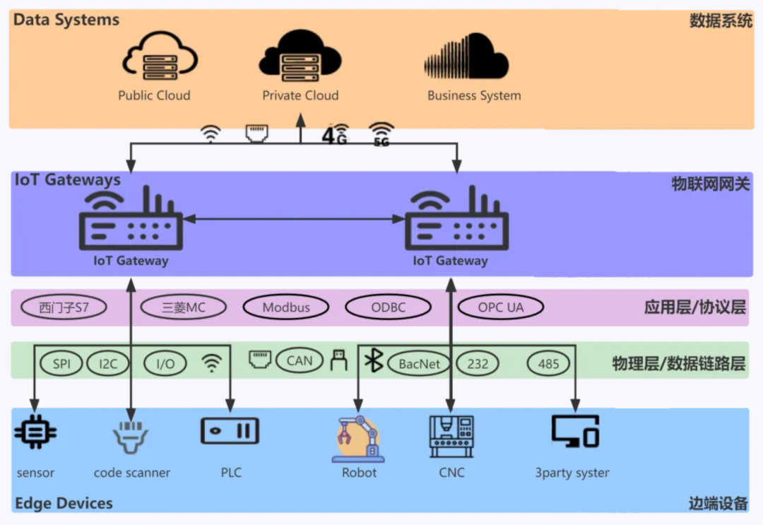 为此,我们在2021年推出了开源项目IoTGateway,一个以简单、稳定、开放为核心的工业数据采集网关,连接工业场景本地设备(如PLC、扫码枪、机器人、数控机床等)与远端业务系统(如IoT物联网平台、SCADA系统、MES系统等)之间的硬件设备或软件程序。终端设备和远端业务系统之间的所有数据通信都通过工业物联网网关来实现,从而让工业设备联网更开放、更简单、更高效。
