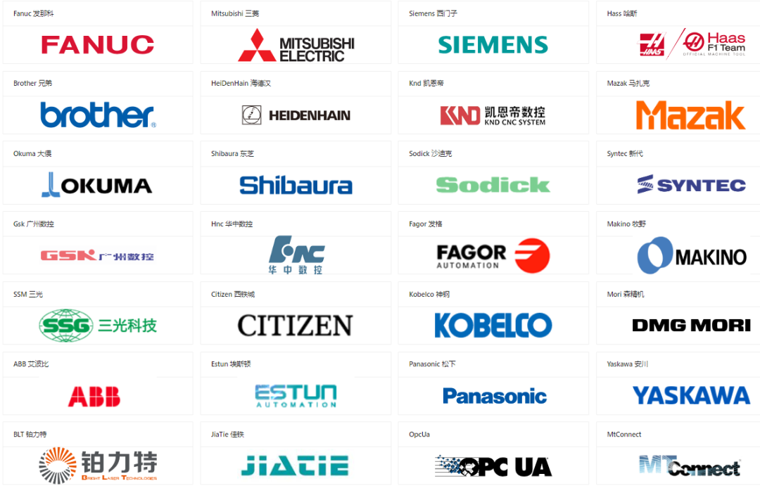 CNC品牌:发那科(Fanuc)、三菱(Mitsubishi)、西门子(Siemens)、哈斯(Hass)、兄弟(Brother)、海德汉(HeiDenHain)、凯恩帝(Knd)、马扎克(Mazak)、大隈(Okuma)、东芝(Shibaura)、沙迪克(Sodick)、新代(Syntec)、广州数控(Gsk)、华中数控(Hnc)、发格(Fagor)、牧野(Makino)、三光科技(SSM)、西铁城(Citizen)、神钢(Kobelco)、森精机(Mori)、爱波比(ABB)、埃斯顿(Estun)、松下(Panasonic)、安川(Yaskawa)、铂力特(BLT)、佳铁(JiaTie)