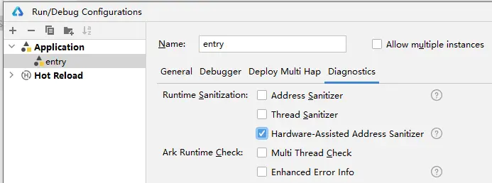 点击Run > Edit Configurations >**Diagnostics,勾选Hardware-Assisted Address Sanitizer**开启检测。