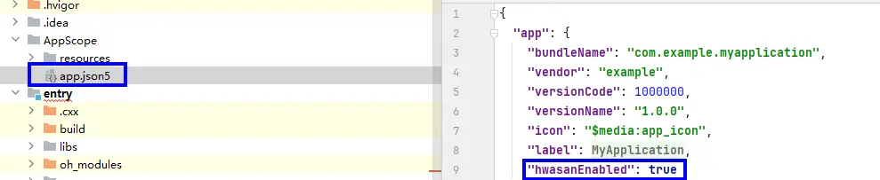- 修改工程目录下的AppScope/app.json5文件,添加HWASan配置开关。