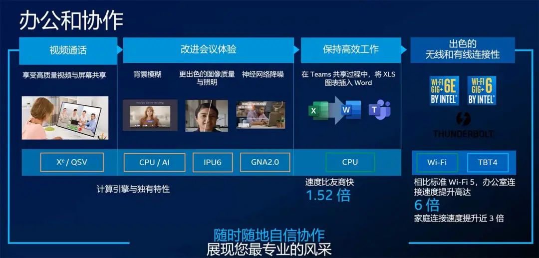 而AI性能的显著提升会更进一步提升PC的使用体验。比如使用Office Teams进行视频会议,因为AI加持,可以让笔记本上的普通摄像头获得浅景深的虚化效果,以及通话声音的降噪。通过采用第11代英特尔酷睿vPro处理器的Microsoft Teams,可以为客户提供行业领先的特性以及出色的体验,例如背景模糊、自定义背景和降噪。这也正是Microsoft和英特尔联手提升协作体验的具体体现。