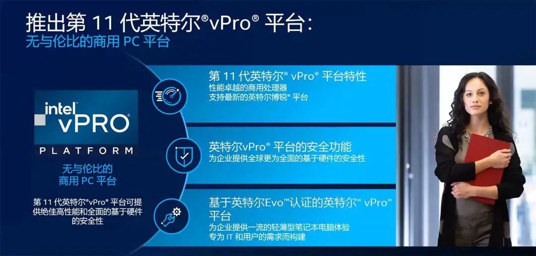 近日英特尔正式面向中国市场推出第11代英特尔vPro平台,并同时推出了基于全新英特尔vPro平台的丰富行业解决方案。全新英特尔vPro平台专为满足现代商用需求而打造,它可以突破业务地域限制,为企业带来企业级的性能、硬件增强的安全功能、出色的远程可管理性和 PC 设备群稳定性,树立商用PC体验新标杆。现代企业的员工同样越来越需要适用于现代移动办公场景的设备,为此英特尔还发布了基于英特尔Evo认证的英特尔vPro平台,为移动商务用户提供出色的轻薄笔记本电脑体验。通过该平台认证的笔记本电脑设计,不仅拥有能够为 IT 部门提供所需的商用PC功能,还可用户提供卓越的移动性、令人惊叹的响应速度、即时唤醒功能和持久的电池实际续航时间。