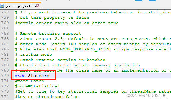 #mode=Standard前面的#注释去掉。这个操作是为了让主控机在执行后在察看结果树下能看到返回的响应信息(repsonse body)