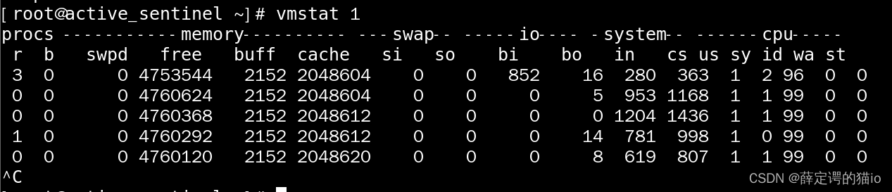 (2)通过 vmstat 1(每隔1秒更新) 命令可以实时查看swap使用情况:
